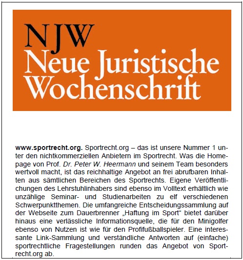 - Die NJW hat einen Artikel über sportrecht.org veröffentlicht. Der Artikel ist hier einsehbar.